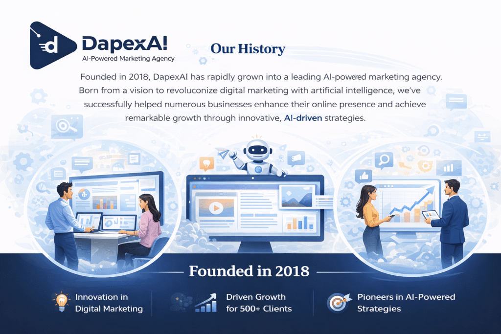 Founded in 2018, DapexAI was built with a clear vision — to transform digital marketing through the power of artificial intelligence and data-driven innovation. What started as a forward-thinking idea quickly evolved into a trusted AI-powered marketing agency, helping brands adapt, scale, and grow in an ever-changing digital landscape. From the very beginning, DapexAI focused on combining human creativity with intelligent automation. By leveraging advanced AI tools, analytics, and performance-driven strategies, we enabled businesses to make smarter marketing decisions and achieve measurable results. Over the years, we have successfully partnered with 500+ brands, delivering impactful solutions across content marketing, SEO, performance advertising, social media growth, and marketing automation. Our continuous commitment to innovation has positioned DapexAI as a growth partner for startups, enterprises, and digital-first businesses alike. Today, DapexAI stands at the intersection of technology, creativity, and strategy, empowering brands to unlock sustainable digital growth and stay ahead in a competitive, AI-driven world.